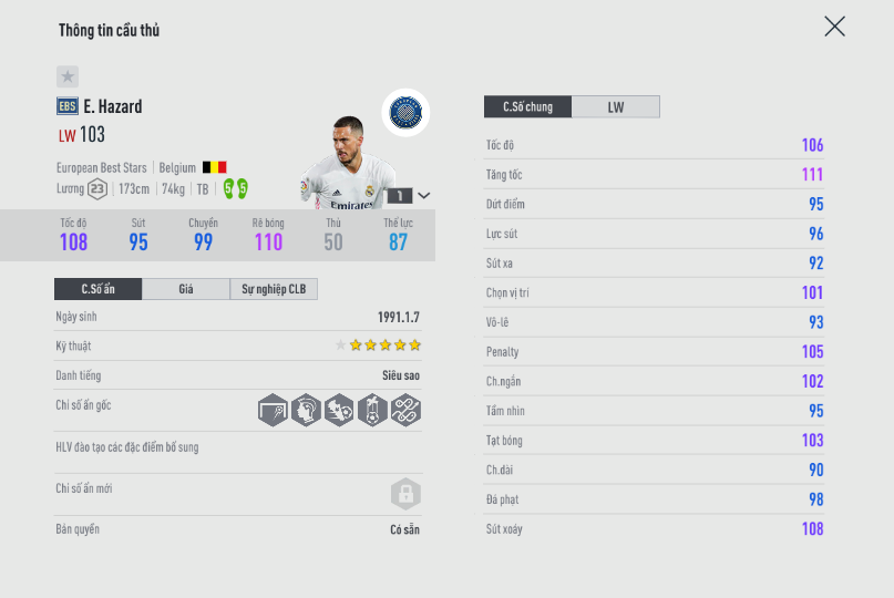 Khả năng thăng bằng tốt, tạt bóng ổn ở cả 2 chân cũng là điểm cộng cho những ai muốn tham khảo Hazard EBS cho team color Real, Chelsea hay Bỉ.