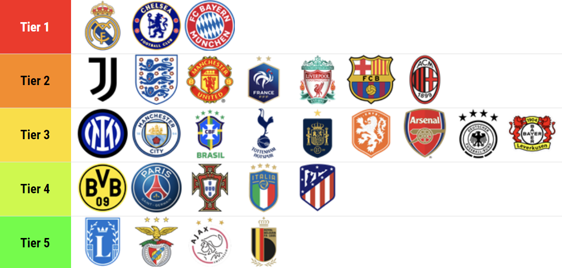 Tier 2 : Juventus, ĐT Anh , Man Utd, ĐT Pháp, Liverpool, Barcelona, AC Milan