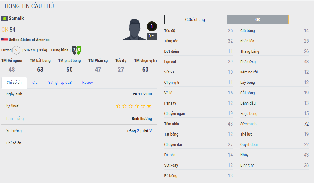 Cái tên cao nhất trong game thuộc về một thủ môn của đất nước cờ hoa tên là J. Samnik với chiều cao 207. Do chỉ số của anh chàng này trong game rất thấp và cũng đã vào giới hạn nên cũng chẳng ai để ý đến, chiều cao luôn là lợi thế của các thủ môn, đặc biệt là trong game Fo4. Không rõ anh chàng này có "ảo ma canada" như nhiều thủ môn khác không nhỉ. Mà ngoài ra còn một cái tên khác thấp hơn 1cm là thủ thành Tomáš Holý của cộng hòa Czech.