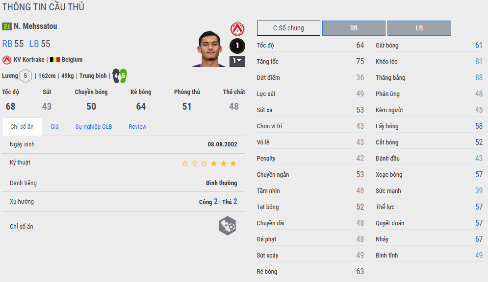 Nếu dùng thuật ngữ " bé như nhái " thì có lẽ khá phù hợp với Mehssatou, khi anh chàng này nặng có 49kg, không rõ vào sân thì anh chàng với hạng cân của các cô gái sẽ trụ thế nào trước những hộ pháp trong game. Tất nhiên ngoài đời thì anh chàng này vẫn thi đấu bình thường, bởi cân nặng không phải thước đo trình độ của cầu thủ. Bằng chứng là chỉ số rất thấp nhưng anh ấy có mặt thật đấy nhé