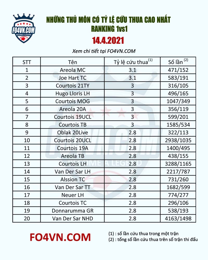 Việc tăng lương 200, đã làm các HLV có suy nghĩ nghiêm túc hơn về vị trí thủ môn. Vậy đâu là người gác đền có tỷ lệ cứu thua trong một trận cao nhất. Chúng ta sẽ đến với danh sách dưới đây