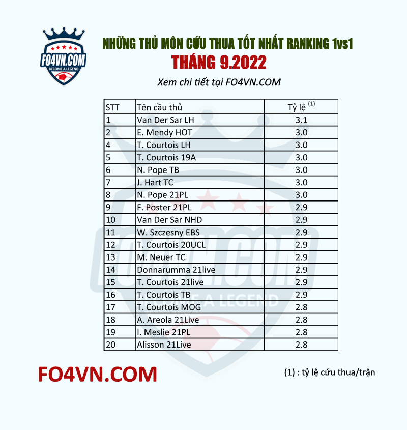Những thủ môn nào trong tháng 9 có được tỷ lệ cản phá bàn thắng tốt nhất, hãy xem danh sách dưới đây.