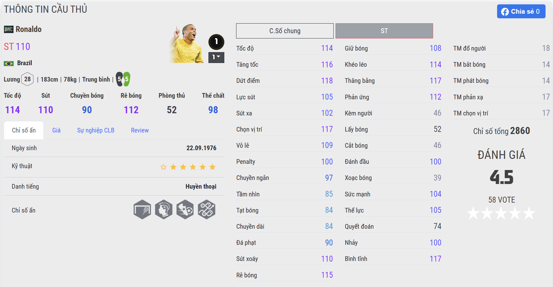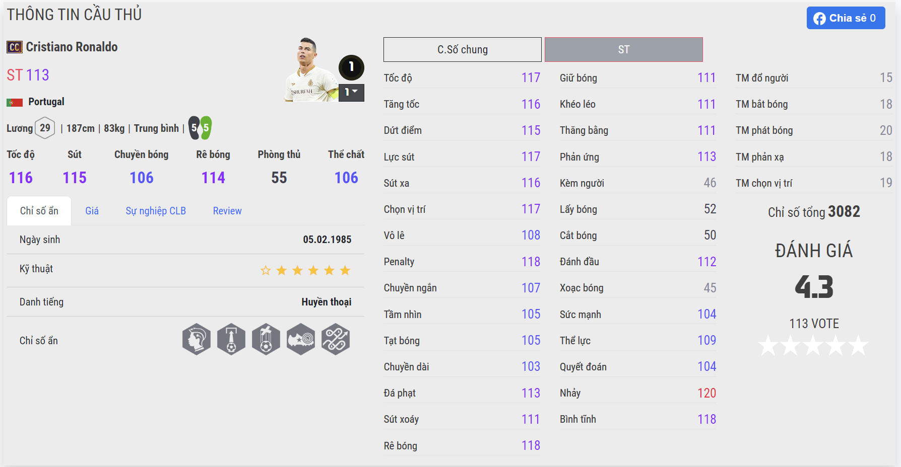 Vốn là một trong những siêu tiền đạo hàng đầu game, mùa giải CC của Ronaldo chứng kiến sự trở lại mạnh mẽ của 1 trong những tiền đạo xuất sắc và toàn diện bậc nhất lịch sử bóng đá thế giới. Mùa giải CC của Cristiano Ronaldo cho thấy độ hiệu quả ghi bàn là rất đáng nể, giúp anh đứng ngang hàng với những tiền đạo mùa Icon TM về độ hiệu quả, cũng như giá trị sử dụng của mình.