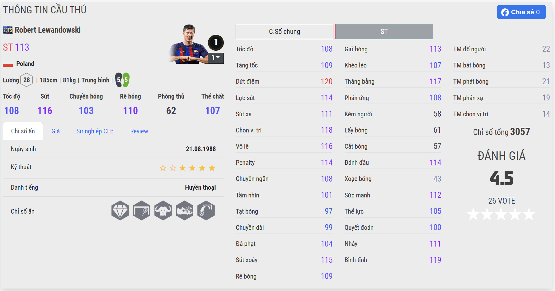Từ lâu Lewy đã là cái tên được nhiều người chơi tin dùng bởi sự toàn diện cho vị trí tiền đạo cắm, từ tốc độ ổn, khả năng dứt điểm miễn chê cùng với một bản năng săn bàn cực kì nhạy bén khi luôn biết cách di chuyển, tìm ra sơ hở để ghi bàn từ sút trong ,ngoài vòng cấm đến những cú đánh đầu cực chất lượng. Không nghi ngờ gì khi Lewy có rất nhiều mùa giải đương đại nằm trong top những chân sút hiệu quả nhất game hiện nay.
