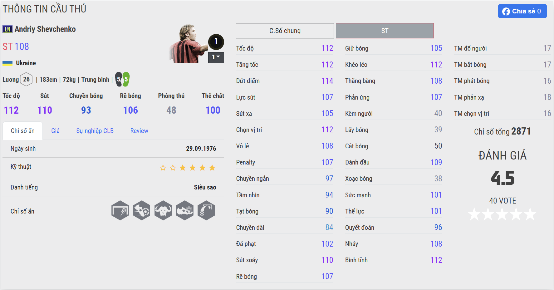 Linh dương Đông Âu sau khi ra phiên bản LN và ICons đã trở lại mạnh mẽ như một tiền đạo nổi bật rất đáng sử dụng. Khả năng rê dắt bóng khéo léo, tư duy di chuyển thông minh, khả năng dứt điểm cũng như khả năng chuyền bóng rất ổn. Ngoài ra, việc nâng cấp Đánh Đầu Mạnh cùng khả năng bật nhảy đánh đầu và chọn vị trí tốt đã khiến Sheva trở lại là một trong những tiền đạo 2 chân 5-5 hay và hot bậc nhất game.