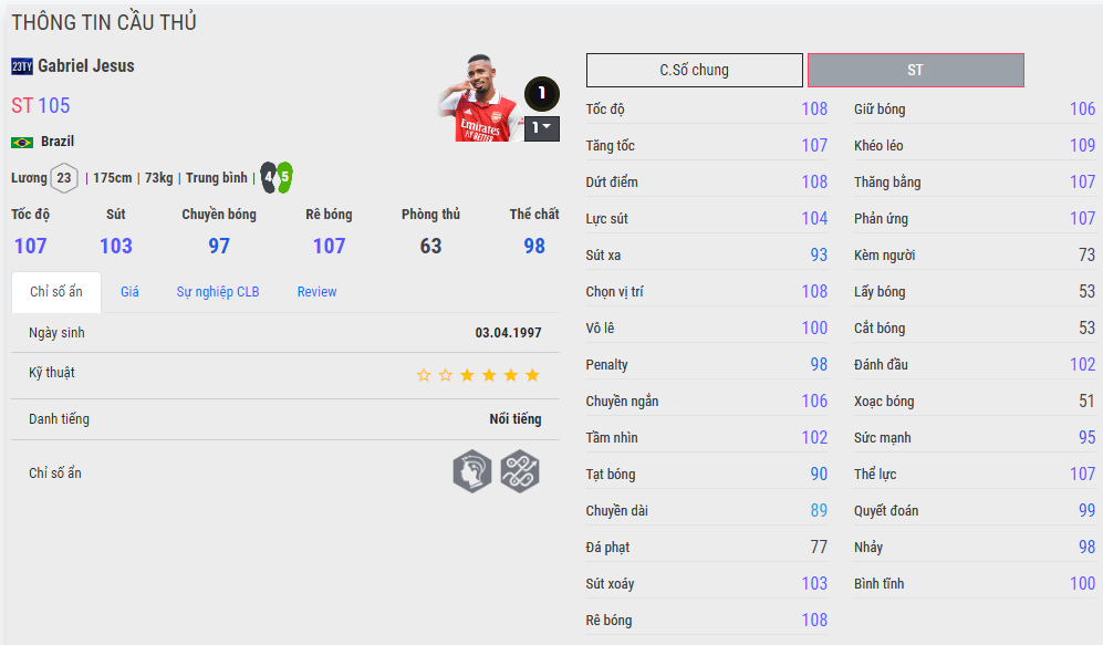 Có thể rất ít người chú ý đến tiền đạo người Brazil đang đá cho Arsenal này, chỉ số cũng không hề nổi bật, chỉ số ẩn thì khá ố dề. Nhưng thực tế thì anh lại chính là cái tên có thể giúp bạn ghi bàn sòn sòn trong các trận đấu Fo4, Jesus là mẫu tiền đạo dạng con thoi, di chuyển thông minh và có phạm vi hoạt động rộng, rất phù hợp với bạn nào thích chơi kiểu tiki-taka.