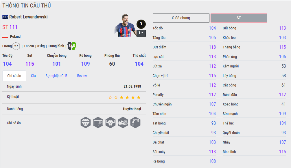Mặc dù không còn được như mùa giải trước 22TY hay 21TY...nhưng Lewandowski vẫn là một chân sút cực khét của game. Bản thân tiền đạo người Ba Lan giờ đây đã chậm hơn 1 chút, tỳ đè yếu đi một chút nhưng bù lại thì sút xa tốt hơn, đóng căng hơn và đặc biệt là có khả năng làm bóng cho đồng đội cực tốt.