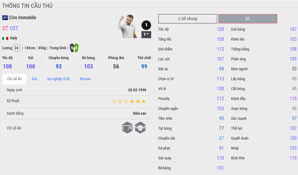Đây là mùa giải đầu tiên mà anh chàng được các HLV Việt Nam gọi với cái tên hài hước " tôi là điện thoại" có được hai chân 5/5. Sở hữu một thể hình rất đầm, Immobile khá dễ đá với đa phần người chơi, thậm chí khoản kết nối với các đồng đội không hề thua kém chút nào với Lewandowski, chỉ có điều danh tiếng của anh không bằng nên khá ít người chú ý đến mà thôi.