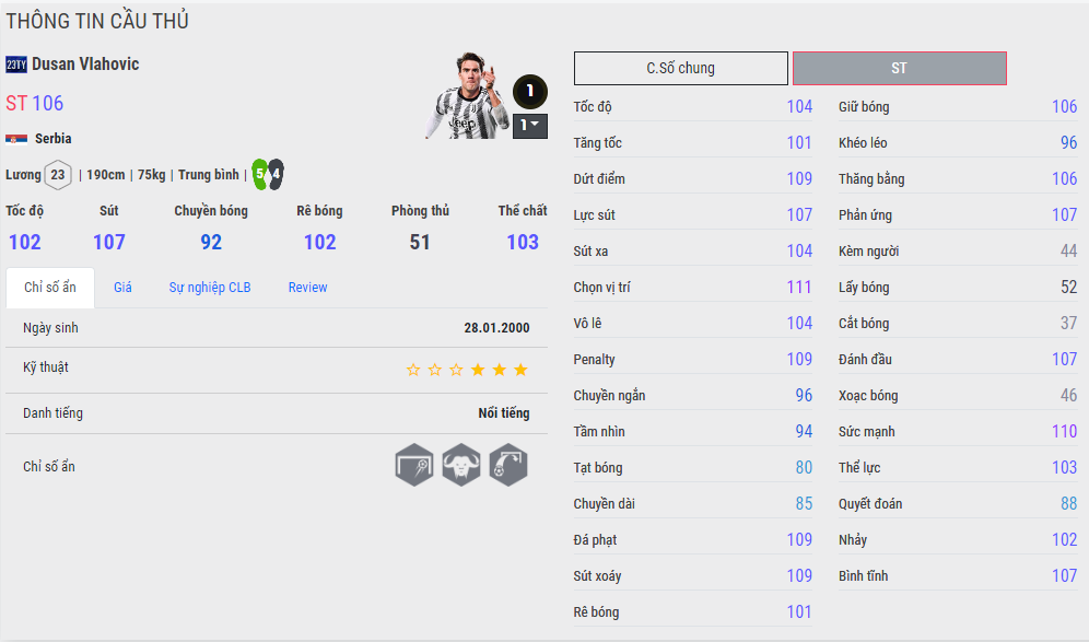 Tiền đạo thuận chân trái này có chiều cao lý tưởng trong gameplay hiện tại, đặc biệt là sải chân dài của anh giúp cho các tình huống băng vào dứt điểm cận thành từ các tính huống căng ngang cực nguy hiểm. Tuy tốc độ không phải là điểm mạnh của Vlahovic nhưng khả năng chọn vị trí trong vòng cấm rất bén. Đá Vlahovic thì bạn nên chọn lối chơi chậm hoặc đánh biên sẽ cực phù hợp với vai trò trung phong cắm của tiền đạo người Serbi