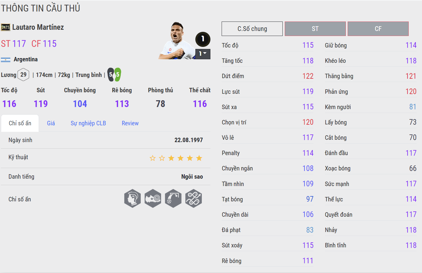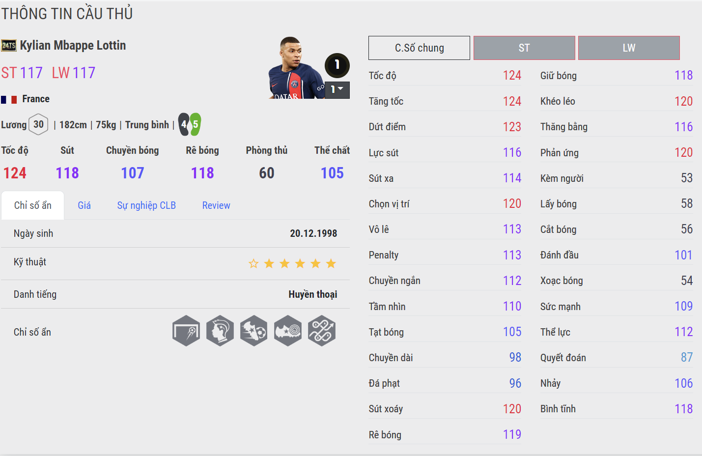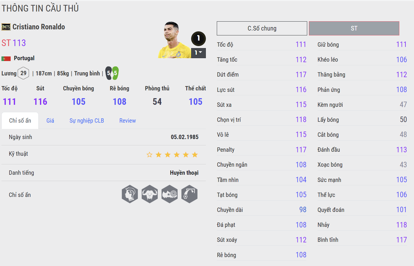 Dù không còn ở độ tuổi đỉnh cao và chỉ số không thuộc hàng top đầu, Ronaldo vẫn luôn được đánh giá cao nhờ tầm ảnh hưởng và AI thông minh. Anh sở hữu khả năng sút tốt bằng cả hai chân, lối chơi đa dạng, khả năng không chiến ấn tượng và hiệu quả.