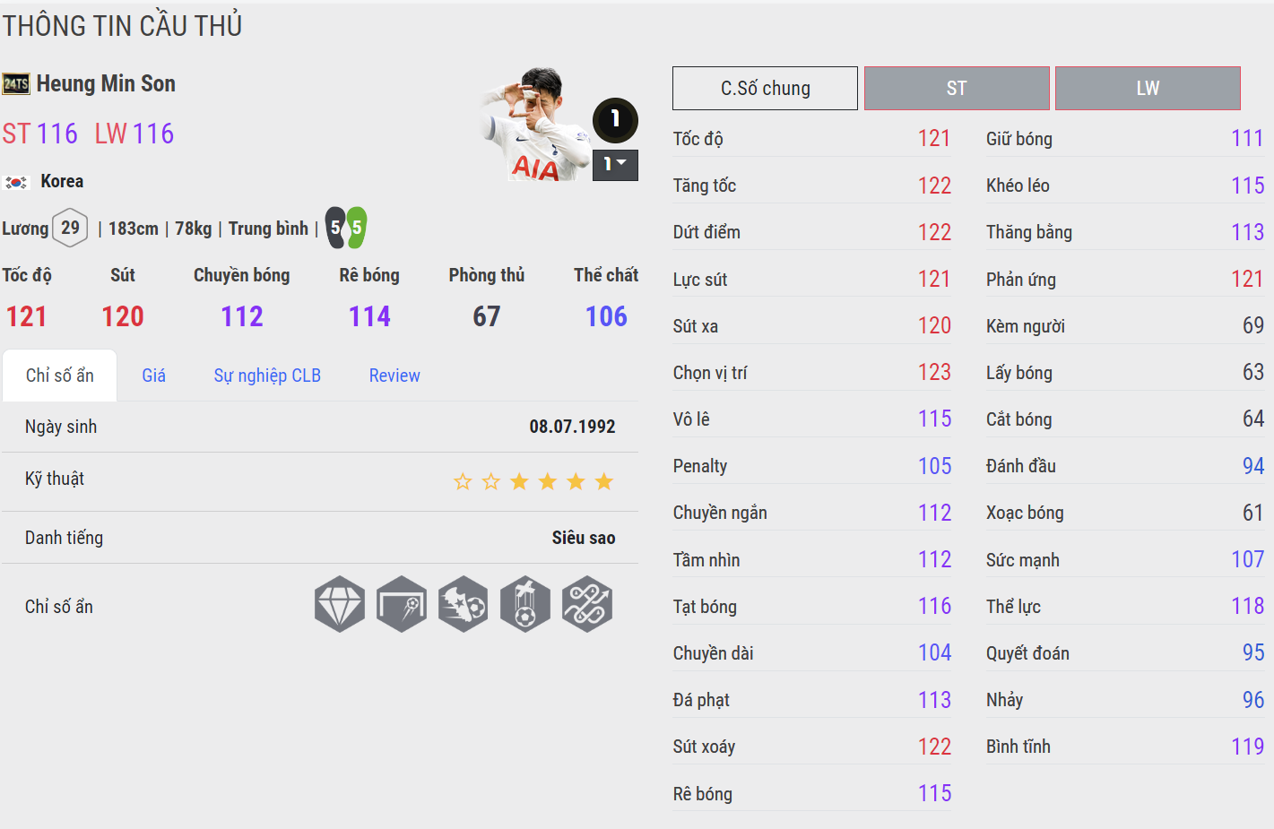 Son Heung Min, ngôi sao được yêu thích của nhà phát hành, có một phiên bản rất đáng dùng với tốc độ tốt, khả năng dứt điểm, sút xa, và ZD đều mang lại tỷ lệ ghi bàn cao. Không chỉ mạnh ở khả năng sút, kỹ năng chuyền bóng, phối hợp và những pha tạt bóng của Son cũng rất hiệu quả.