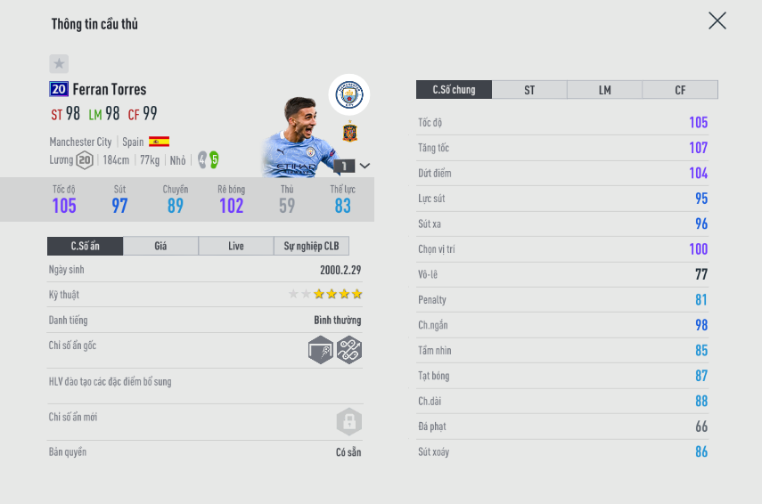 Chàng tiền đạo được kéo từ đá cánh vào trung tâm. Mùa duy nhất của anh đá ST là 20UCL. Điểm mạnh của Torres là tốc độ và một khả năng đi bóng rất dẻo. Cao tới 1m84 và nặng 77kg. Đây là một phiên bản lai giữ 3 cái tên kể trên. Bạn hoàn toàn có thể biến Torres thành một sát thủ bên cạnh Balotelli hay Aguero. Điểm yếu của anh chàng là hơi yếu.
