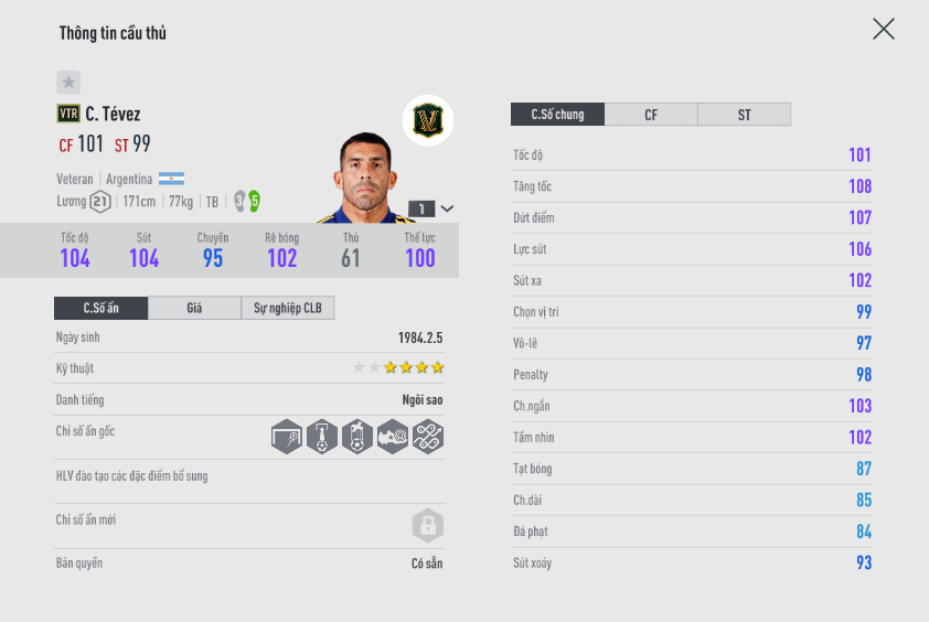 Cựu ngôi sao một thời gánh MC. Là một cầu thủ lực thực sự về mặt thể chất và lối chơi. Tevez có thể cày nát cả sân nếu bạn cần một tiền đạo di chuyển rộng. Khả năng đóng xa cực tốt. Ngoài ra là việc Tevez có thể phối hợp chuyền bóng cùng đồng đội cực kỳ ổn định. Nếu bạn cần một tiền đạo ảo hay đá tiki taka thì đây là một lựa chọn tối ưu. Khi mà Tevez không hề tỏ ra yếu thế trước các hậu vệ to cao khác. Mùa giải được chọn là VTR
