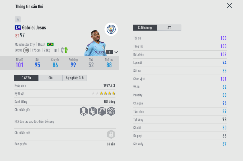 Có khá nhiều mùa giả Jesus trong game. Tuy nhiên mùa giải 19UCL lại cho chúng ta một tiền đạo mắn bàn nhất của cầu thủ này. Lối chơi có phần nào giống với Aguero tuy nhiên kém hơn một chút, ngược lại thì khả năng chơi bóng bổng lại tỏ ra vượt trội khi mà Jesus ít nhất còn biết chơi đầu.