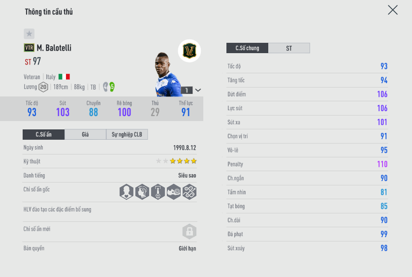 Là bad boy từng có giai đoạn khá tai tiếng khi khoác áo đội bóng. Thế nhưng tài năng của tiền đạo này là không thể bàn cãi. Mẫu ST cao to hữu dụng nhất của MC trong meta game hiện tại. Bạn có thể sử dụng để làm tường, đánh đầu hay làm chủ lực đều được. Hiệu xuất ghi bàn không thua kém gì Aguero. Mùa giải được lựa chọn là VTR