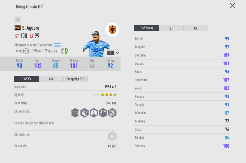 Mùa giải hay nhất của Aguero trong game hiện tại là MOG. Một sát thủ với tốc độ và khả năng nhạy bén đến kinh người. Điểm yếu duy nhất của Kun là anh lùn. Khả năng chơi bóng bổng kém, và hay bị các hậu vệ như kiểu Van Dijk bắt nạt. Bạn sử dụng Aguero hãy gắn cho anh ấy kỹ năng "nhạy bén" để có thể yêu cầu xâm nhập bất cứ lúc nào và bạn sẽ thấy Kun lợi hại thế nào.