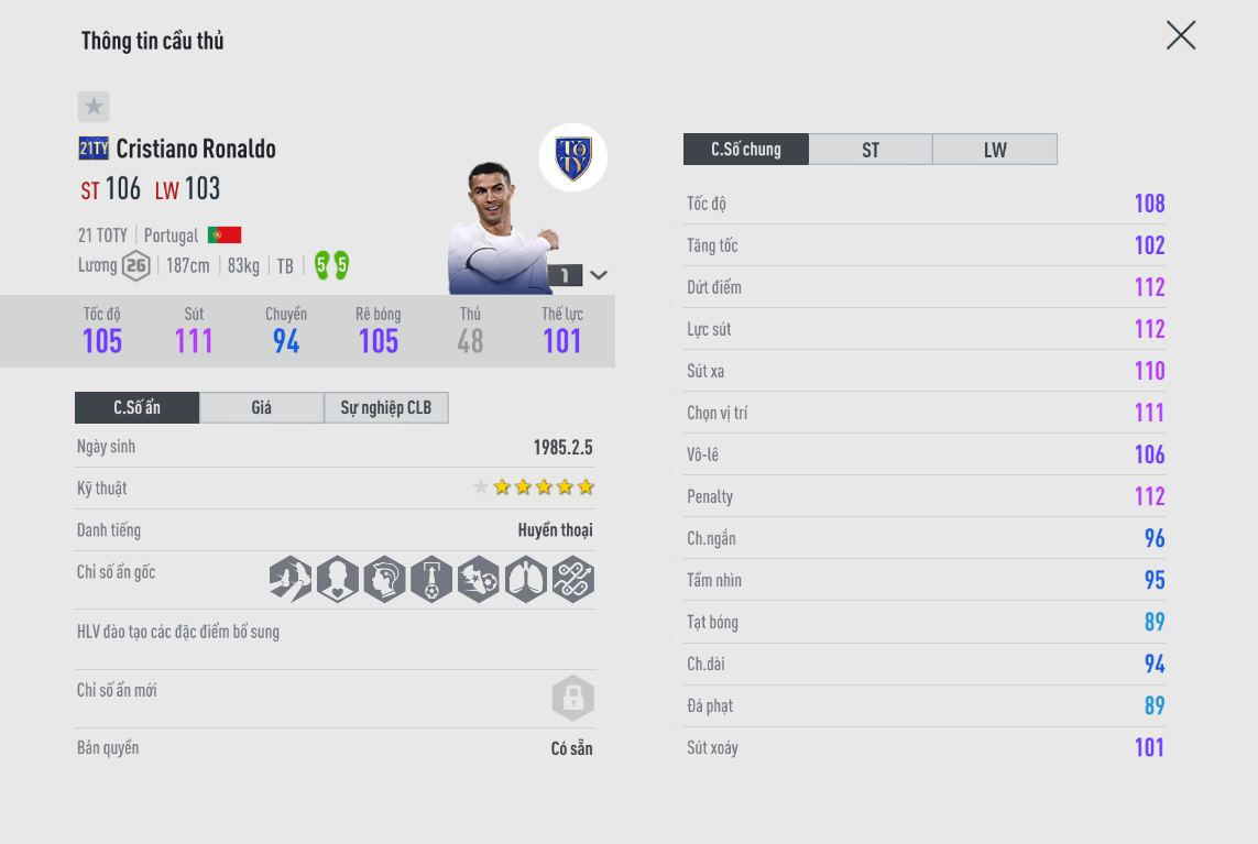 Khỏi phải bàn về huyền thoại đương đại này của Real. Vấn đề của Ronaldo là anh có quá nhiều mùa giải để lựa chọn. Tất nhiên lời khuyên cho các bạn là mùa 21TY hoặc LH với hiệu suất cao nhất và khả năng đóng góp lối chơi quá tốt