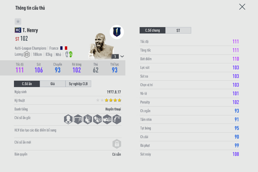 Henry là một tiền đạo cực hợp cho Barca, bởi tốc độ và khả năng ban bật tốt của mình. Mùa giải xứng đáng nhất chính MC. Với hiệu xuất ghi bàn cực tốt và khả năng kiến tạo cho đồng đội cũng cực ổn. Henry MC chuyền bóng có độ chính xác cao. Nếu nói không quá là còn tốt hơn nhiều tiền vệ trong game này.
