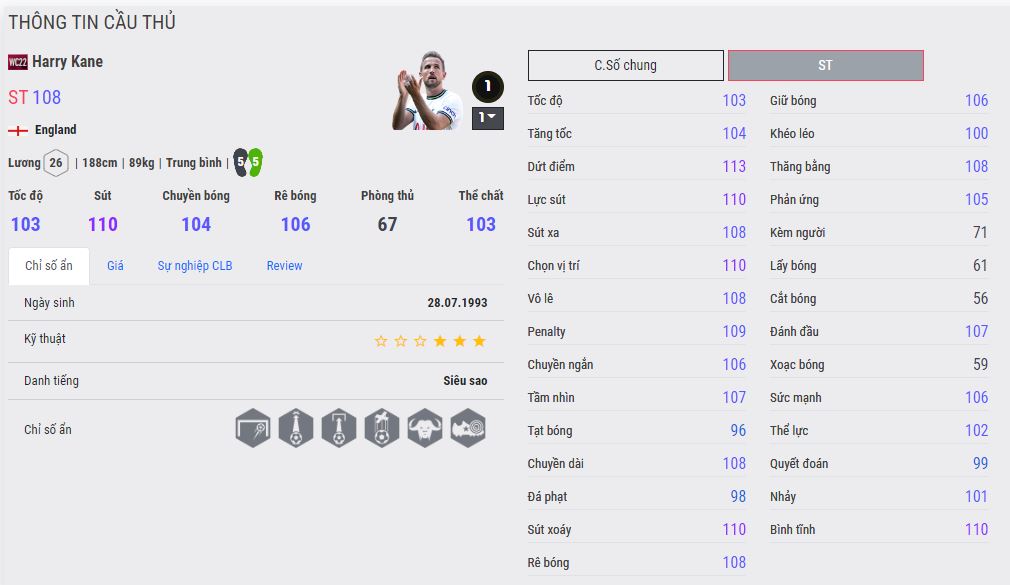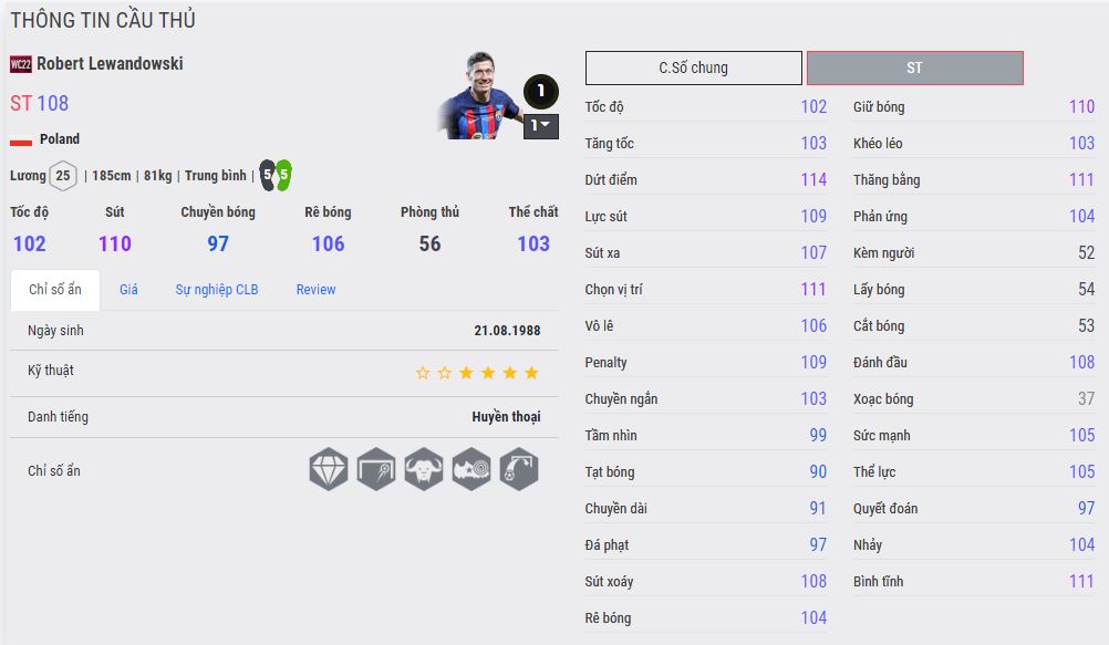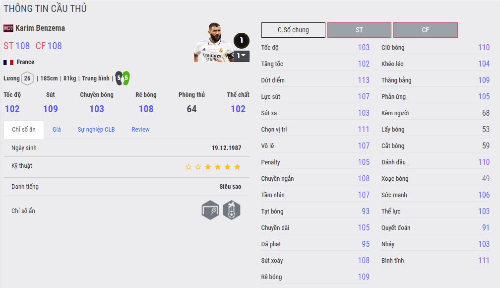 Thêm một mùa giải mà chân sút người Pháp có hai chân 5/5 nhưng loạt chỉ số ẩn bị thu gọn đi rất nhiều, Benzema mùa giải World Cup 22 vẫn còn đó là khả năng dứt điểm ổn định bằng hai chân, các tình huống làm bóng cho đồng đội chuẩn chỉ. Nhưng việc thiếu đi khá khá các chỉ số ẩn kiểu đánh đầu mạnh, ma tốc độ làm nhiều người có phần phân vân. Tuy vậy khi đưa vào thực chiến thì mới thấy rằng việc thiếu đi những chỉ số trên nó không tạo ra sự khác biệt nhiều với một Ben ú mà chúng ta vẫn quen thuộc trong game. Vẫn ghi bàn bằng đầu rất tốt, thậm chí còn tốt hơn cả mùa 21UCL.