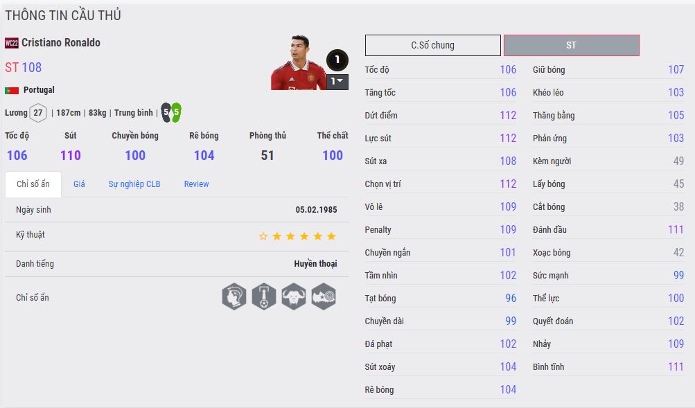 Khác với các phiên bản cũ của mình, Ronaldo WC22 bị lược bỏ khá nhiều chỉ số ẩn và chỉ số cũng không bằng 22TS. Nhưng độ sắc bén trong các tình huống dứt điểm vẫn là tuyệt vời và đây là sự lựa chọn tối ưu dành cho những ai đã bỏ lỡ cơ hội được sở hữu 22TS. Ronaldo WC22 có thể không nhanh lắm những bù lại có được khoản chạy chỗ vẫn rất hay.