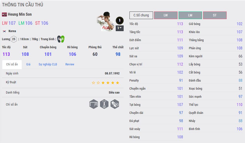 Niềm hi vọng của bóng đá Hàn Quốc và là ngôi sao sáng nhất của đội tuyển xứ kim chí thì tất nhiên AI của Son không thể xem thường. Khi trở về đội tuyển quốc gia thì Son sẽ đóng vai trò là tiền đạo cắm và chơi đúng nghĩa với một số 9 trong đội hình. Bạn cứ thử đưa Son WC22 vào đá ST mà xem, rất hay đấy. Không phải suy nghĩ các vấn đề về thể hình hay không chiến làm gì, tốc độ nhanh và khả năng chạy chỗ như hack sẽ làm bạn hài lòng.
