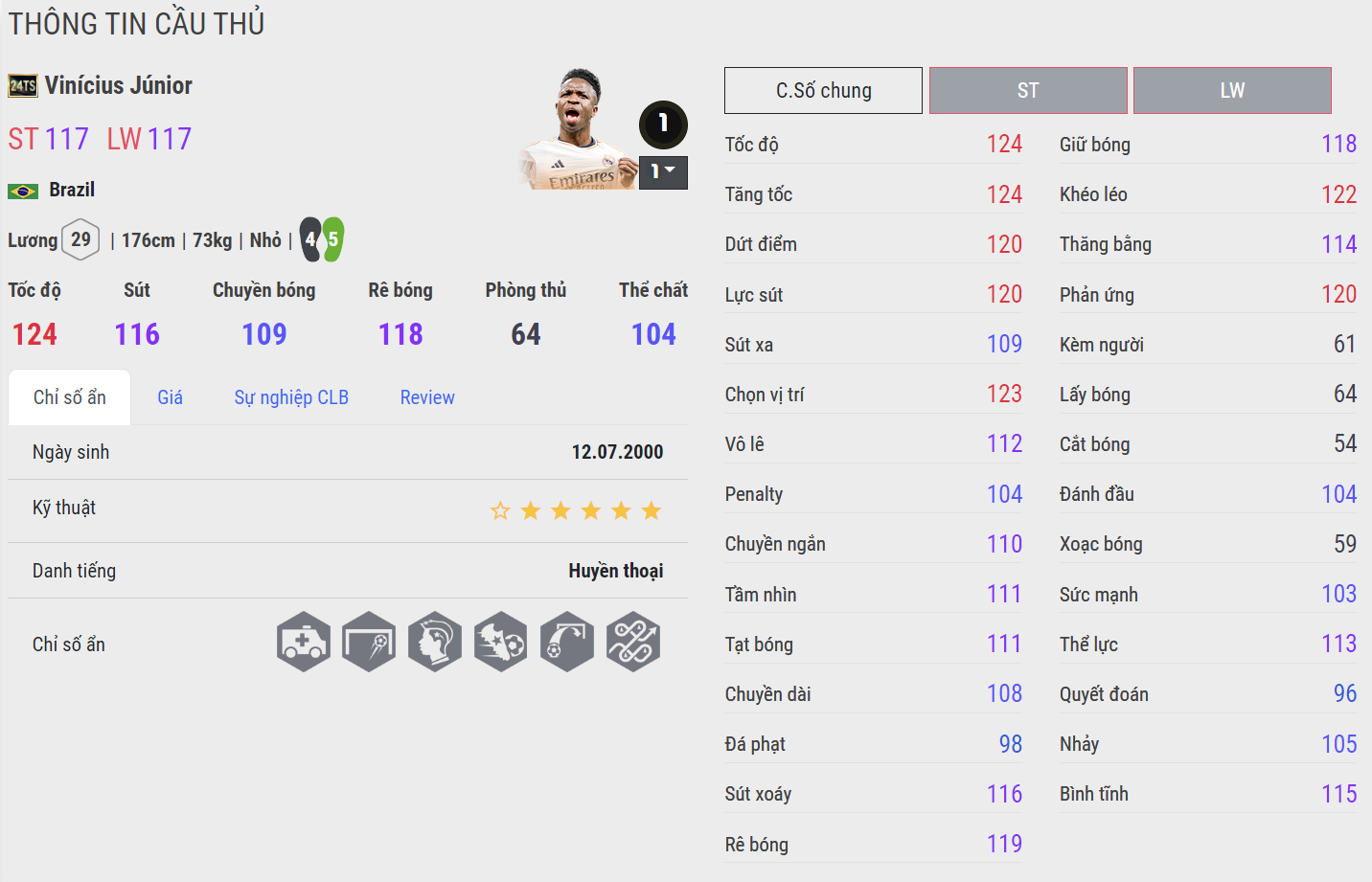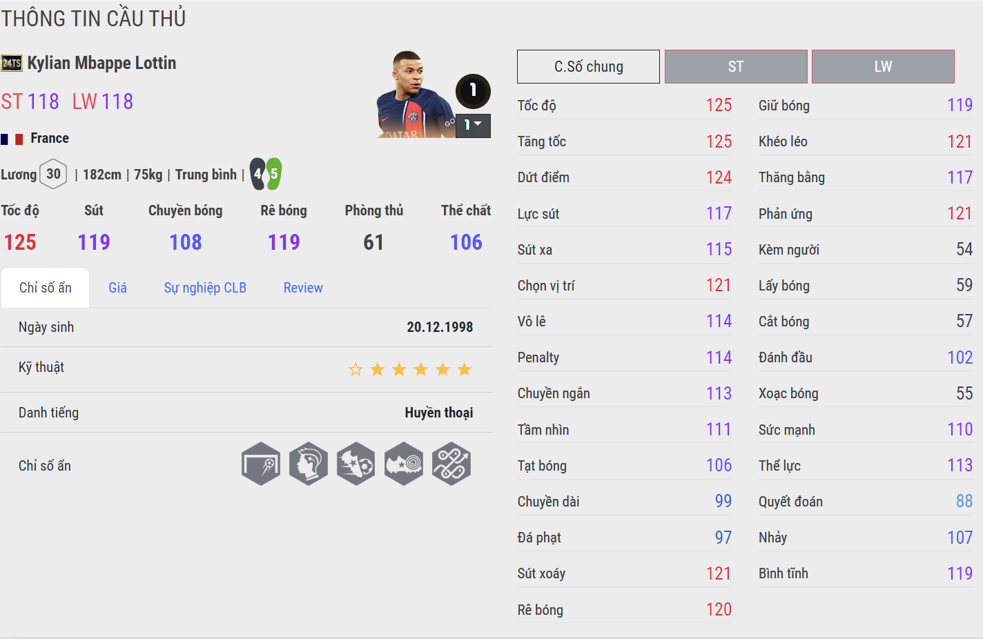Kylian Mbappé luôn được coi là một trong những tiền đạo cánh hàng đầu, không chỉ trong FC Online mà còn trong thực tế. Với tốc độ vượt trội và kỹ năng dứt điểm xuất sắc, Mbappé thể hiện khả năng xử lý bóng rất hiệu quả. Tuy nhiên, một điểm yếu đáng chú ý của tiền đạo người Pháp là khả năng tạt bóng chưa thực sự nổi bật, điều này có thể khiến anh gặp khó khăn trong những tình huống phối hợp tấn công với các đồng đội.