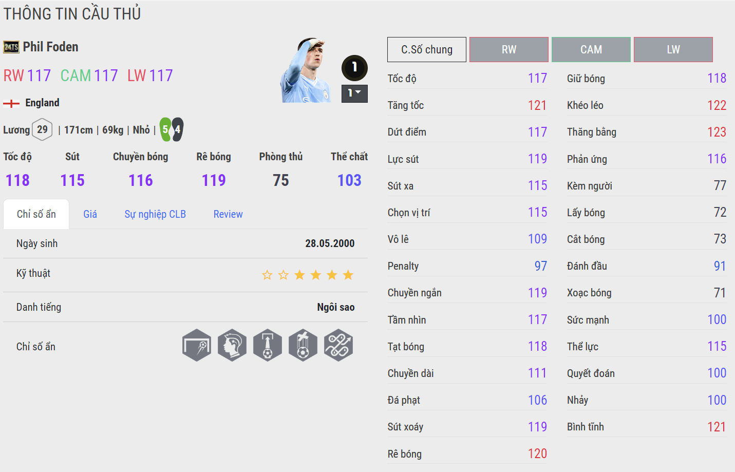 Dù không nổi bật tại Euro, Foden vẫn là cái tên cực kỳ nổi bật ở mùa giải vừa qua trong màu áo Man City. Anh sở hữu tốc độ nhanh nhẹn, khả năng rê bóng dẻo dai và kỹ năng dứt điểm nổi bật. Foden còn cho thấy hiệu quả trong các cú sút xa và khả năng chuyền bóng trong vòng cấm, cùng những pha chọc khe ngắn.
