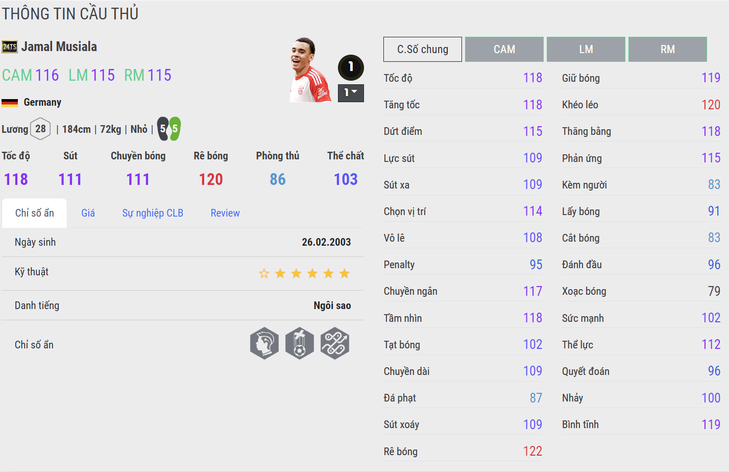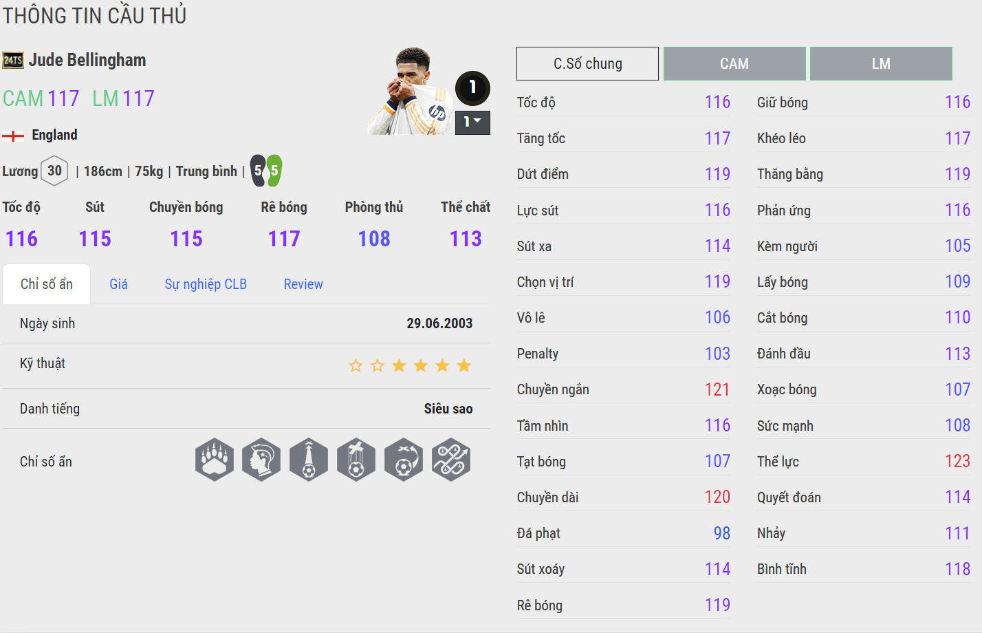 Bellingham đang được đánh giá là cái tên cực kỳ chất lượng ở mùa thẻ 24TS. Sở hữu thể hình trung bình giúp cải thiện đáng kể khả năng tranh chấp. Từ tốc độ, dứt điểm, sút xa đến khả năng chuyền bóng, Bellingham đều rất tốt. Khả năng rê dắt và xử lý bóng của anh cũng rất hiệu quả, khiến anh trở thành cái tên toàn diện cho vị trí tiền vệ công.