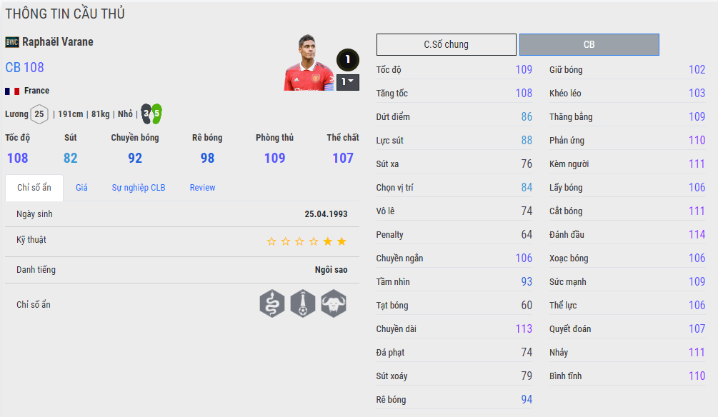 Trung vệ người Pháp đang đá cho MU là một cái tên quá đỗi quen thuộc vào nhiều người chơi FO4, trải qua 5 năm thì Varane vẫn luôn sừng sững là cái tên bất chấp mọi gameplay, mọi biến đổi về chỉ số. Thậm chí Varane mùa giải LH còn xuất hiện trở lại trong danh sách này, một lần nữa cho thấy rằng ở thời điểm ra mắt cách đây 3 năm thì Varane LH out trình như thế nào với phần còn lại khi đó.