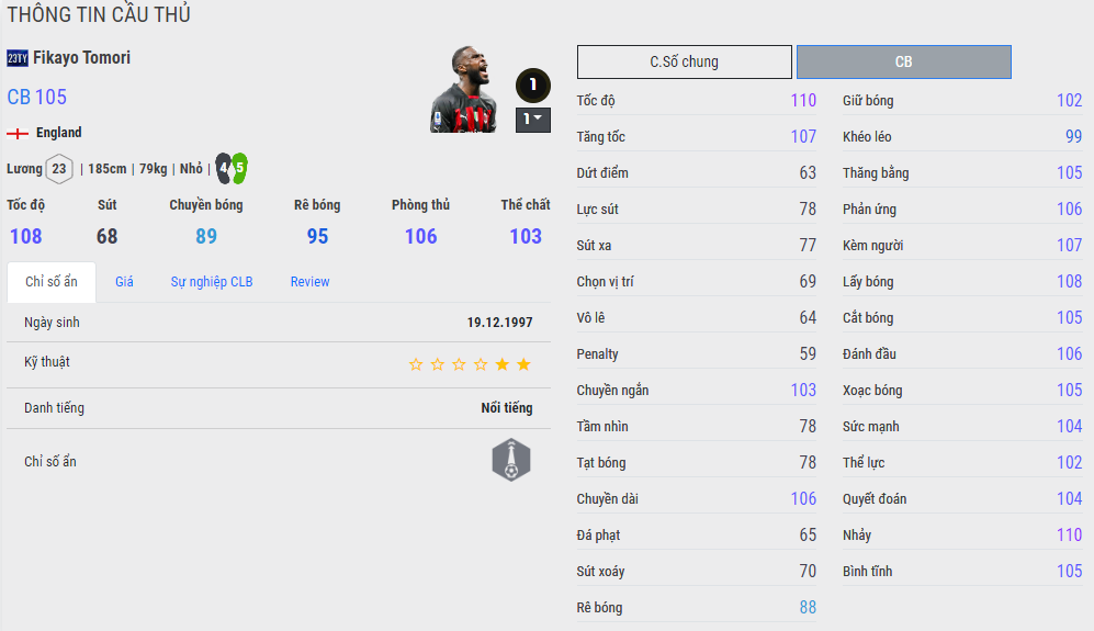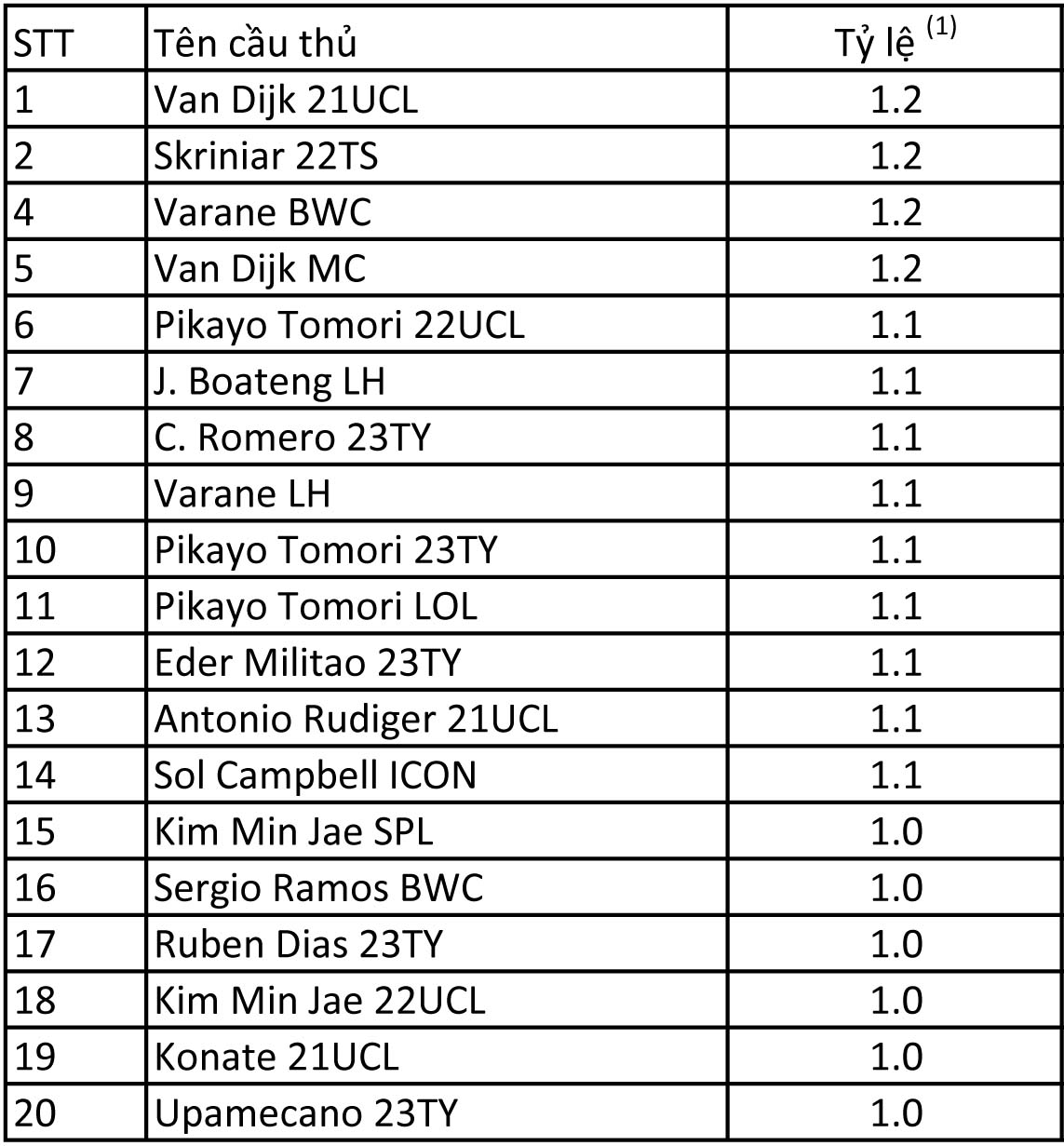 Có tới 3 phiên bản của Tomori trong danh sách 20 cái tên cắt bóng hàng đầu bao gồm 22UCL, 23TY và LOL. Đáng chú ý phiên bản 22UCL hoàn toàn có thể tăng được chỉ số nếu Ac Milan đi tiếp. Tomori được nhiều HLV đánh giá là không được khôn lắm nhưng đươc cái nhanh và dễ đá. Nhưng xem ra những thống kê của Nexon lại cho thấy một góc nhìn khác về trung vệ người Anh này.