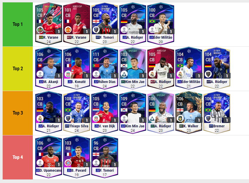 Vị trí top đầu thuộc về những cái tên mà có lẽ đa phần người đều có thể điểm mặt chỉ tên là Varane, Rudiger, Militao, Tomori. Như vậy là ba trên bốn cái tên đều là cầu thủ của Real Madrid, có hai người có team color Chelsea. Không khó hiểu tại sao mà lượng người chơi Real nhiều đến vậy, ít nhất hàng phòng ngự của họ luôn vô cùng chất lượng.