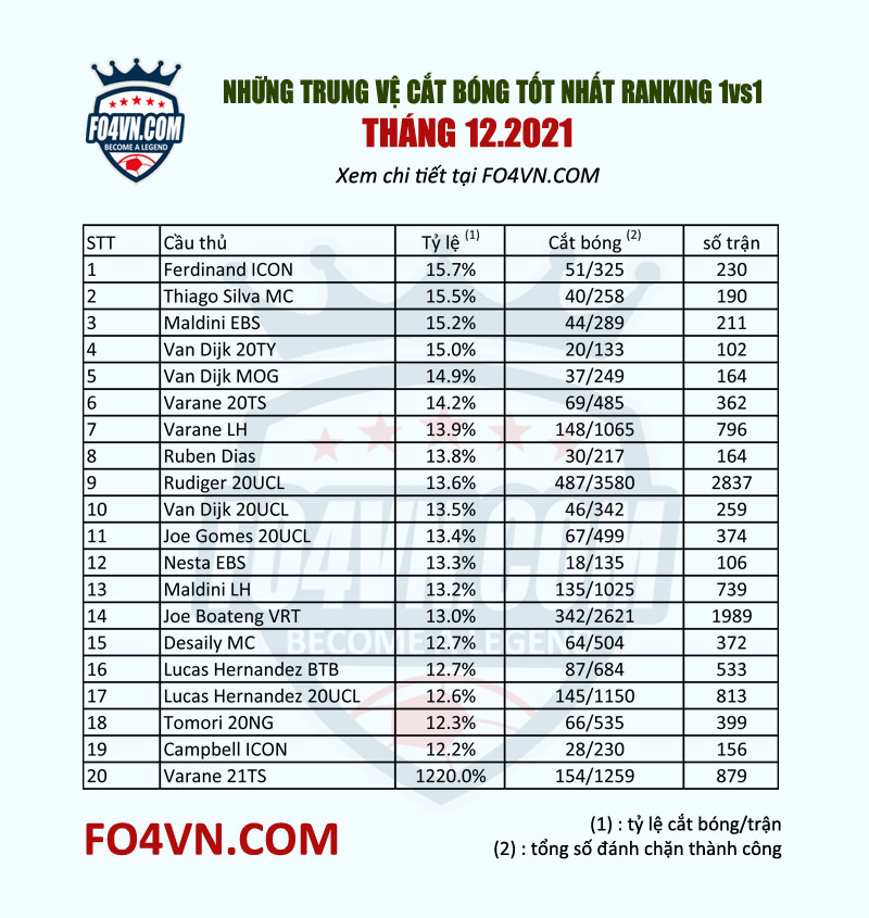 - Ferdinand và Campbell là hai trung vệ mùa ICON được tin cậy cao nhất với tỷ lệ cắt bóng cực ổn
