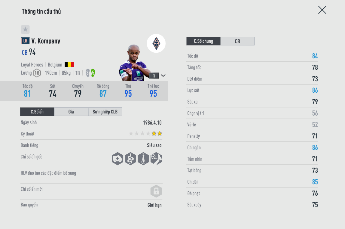 huyền thoại của Man City từng được ví như một trung vệ thép bởi sức mạnh quá khủng, lối chơi quá cứng trong các pha tranh chấp. Kompany trong game chưa bao giờ được đánh giá về AI tuy nhiên giờ đây khi mà các trung vệ đã được nâng cấp kha khá thì Kompany thực sự là một cái tên cần thiết cho hàng phòng ngự của tuyển Bỉ hay Man City. Hiện tại may mắn là Kompany vẫn có thể dễ dàng sở hữu.