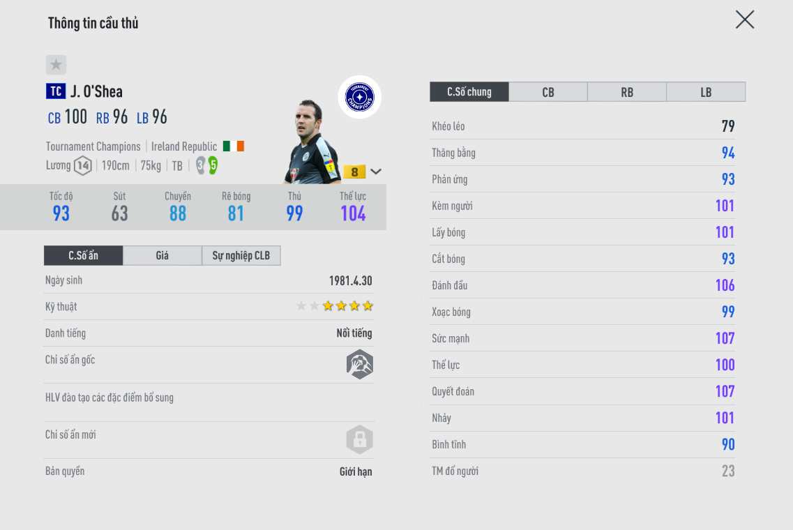 Trung vệ từng khoác áo MU thậm chí còn làm thủ môn bất đắc dĩ này. Hiện chỉ có một mùa duy nhất là TC. Và việc sở hữu anh hiện tại là rất khó khi số lượng hàng rất hiếm. O'shea là mẫu trung vệ có thừa sức mạnh và tốc độ. Điểm yếu của anh là kén người chơi và vào bóng đôi khi thiếu đi độ chuẩn xác mà thôi