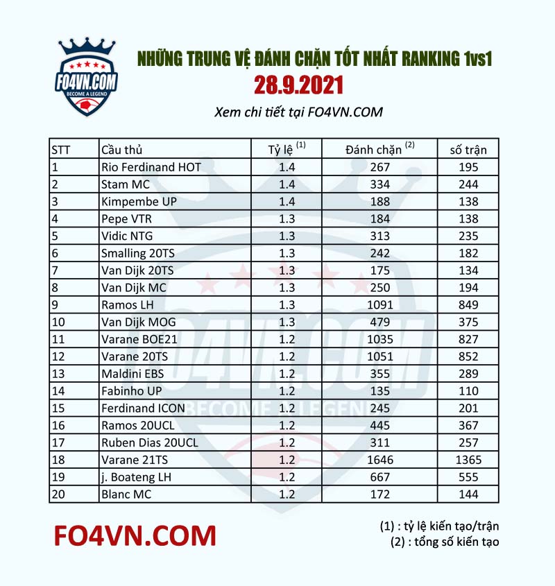 Mời các bạn đến với bảng xếp hạng những trung vệ đánh chặn tốt nhất của tháng 9.