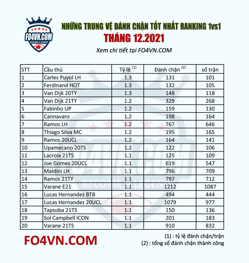 Tiêu chí đầu tiên chúng ta tính đến là đánh chặn của các trung vệ. Các bạn chú ý là tùy theo từng tiêu chí và thời điểm lấy đánh giá nên có thể sẽ có nhiều cầu thủ không có thứ hạng cao.