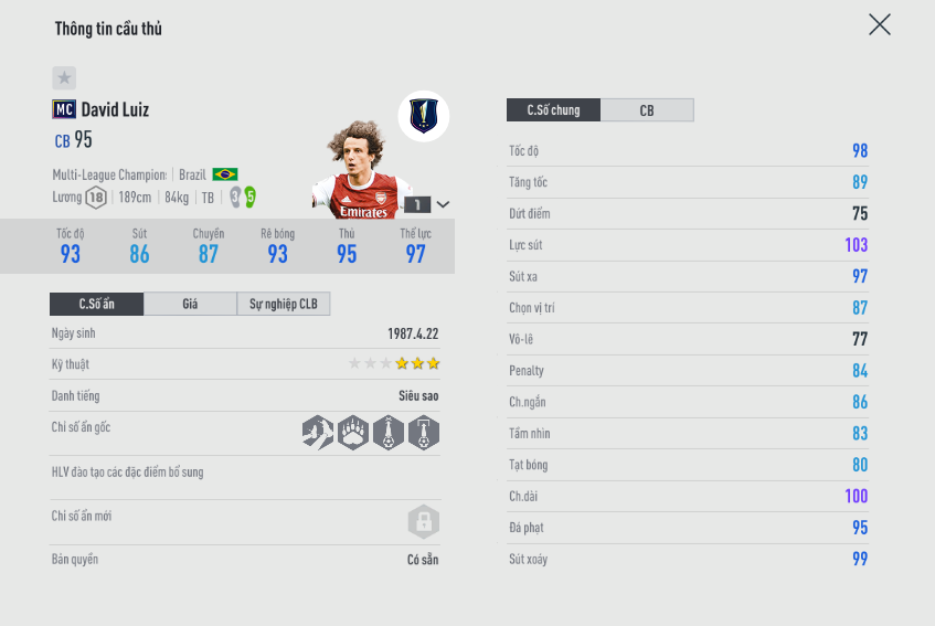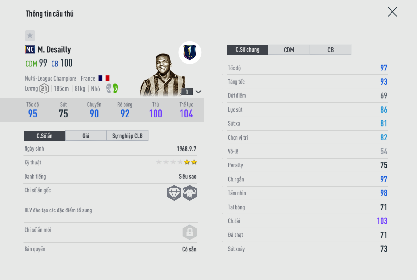 Đây lại là cái hay nhất dành cho team Chelsea cho đến lúc này ở vị trí trung vệ. Nếu bạn từng có suy nghĩ về một Desailly ở Fo3 hay ác cảm với các hậu vệ dính thể hình gầy, thì hãy bỏ suy nghĩ đó ngay đi, vì Desailly MC là một sự khác biệt hoàn toàn với những gì bạn đã biết. AI khôn ngoan, chọc chân cực hay và quan trọng là đừng mơ mà sửa lưng được huyền thoại người Pháp.