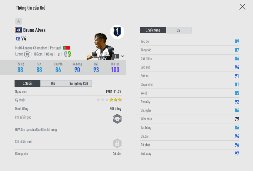Trung vệ kỳ cực của Bồ Đào Nha với sức mạnh có thừa. bạn cần sự chắc chắn hay một hòn đá tảng ở hàng phòng ngự thì đây là cái tên xứng đáng. Việc sở hữu chiều cao và cân nặng tốt, sẽ giúp anh cực khỏe trong tỳ đè. Không mạnh trong khâu cắt bóng như Pepe hay Dias, nhưng bù lại Bruno Alves có khả năng cản phá rất tốt.