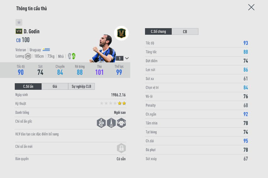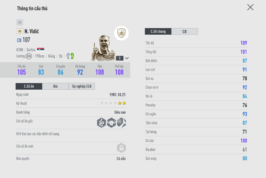 Một huyền thoại cực khủng trong game, nhưng giá của anh lại không hề rẻ chút nào. Mặc dù quãng thời gian khoác áo Inter Milan không nhiều, khi đã ở cuối sự nghiệp, nhưng với những người xây dựng team color thì đây là cái tên cực kỳ quý giá. Bởi ai cũng biết Vidic cứng như thế nào. Hạn chế duy nhất là anh không có mùa giải thường nào cả.