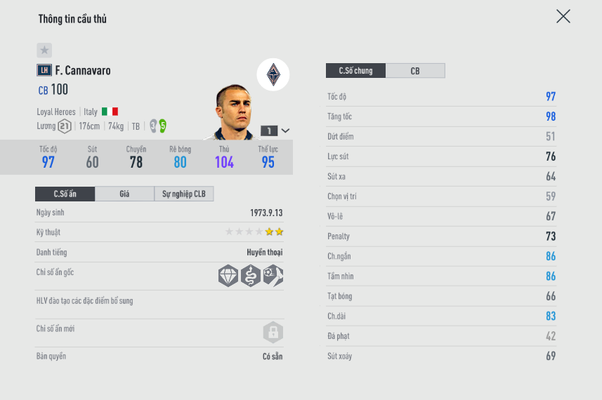 Siêu trung vệ của tuyển Ý và một thời làm mưa làm gió ở Fo3. Nhưng sang Fo4 anh hơi bị lép vế vì lùn... Điều làm nên thương hiệu của anh là siêu cản phá cũng không được thể hiện một cách rõ ràng như ở Fo3. Tuy vậy bạn có thể dùng anh với vai trò một máy quét ở hàng thủ. SW vẫn là vị trí mà Cannavaro phát huy tốt nhất trong sơ đồ 5 hậu vệ