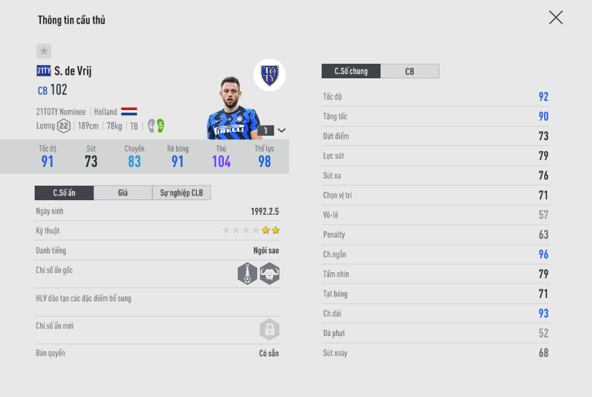 Một bổ sung chất lượng cho Inter khi số 3, 4 quá nhỏ bé. Tuy vậy AI của cầu thủ này lại không được đánh giá cao. Bạn sẽ mất nhiều công sức để điều khiển cầu thủ người Hà Lan hơn. Điều duy nhất mà De Vrij hơn Cannavaro và Godin là thể hình. À mà thể hình sắp tới cân nặng sẽ rất quan trọng đấy.