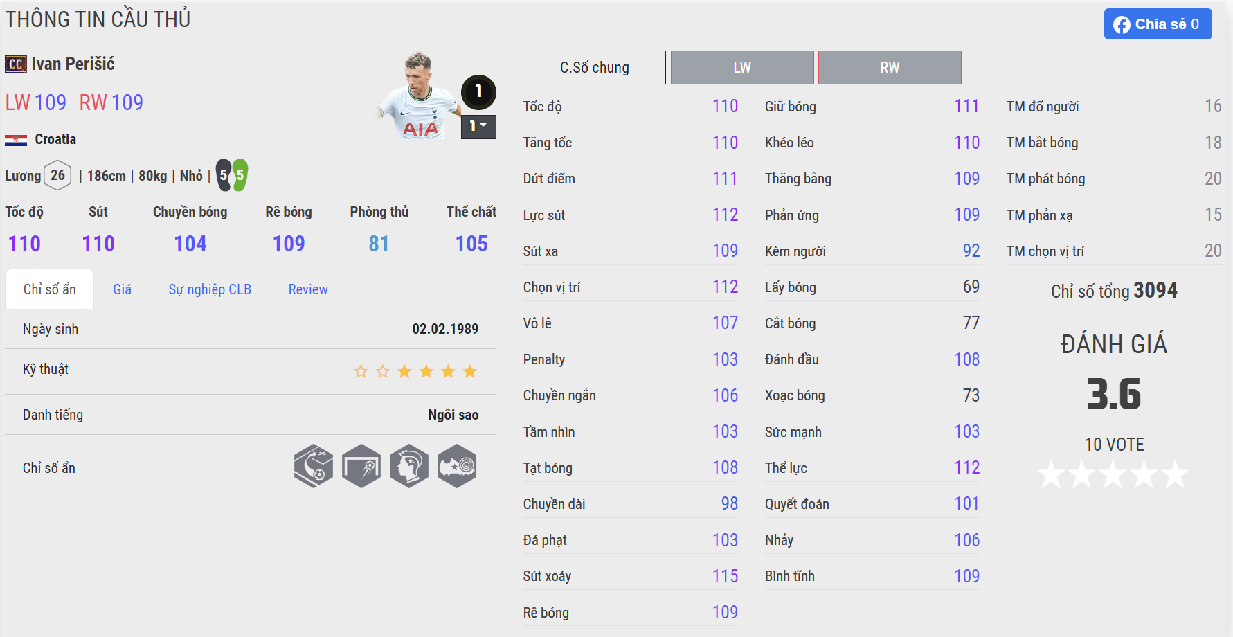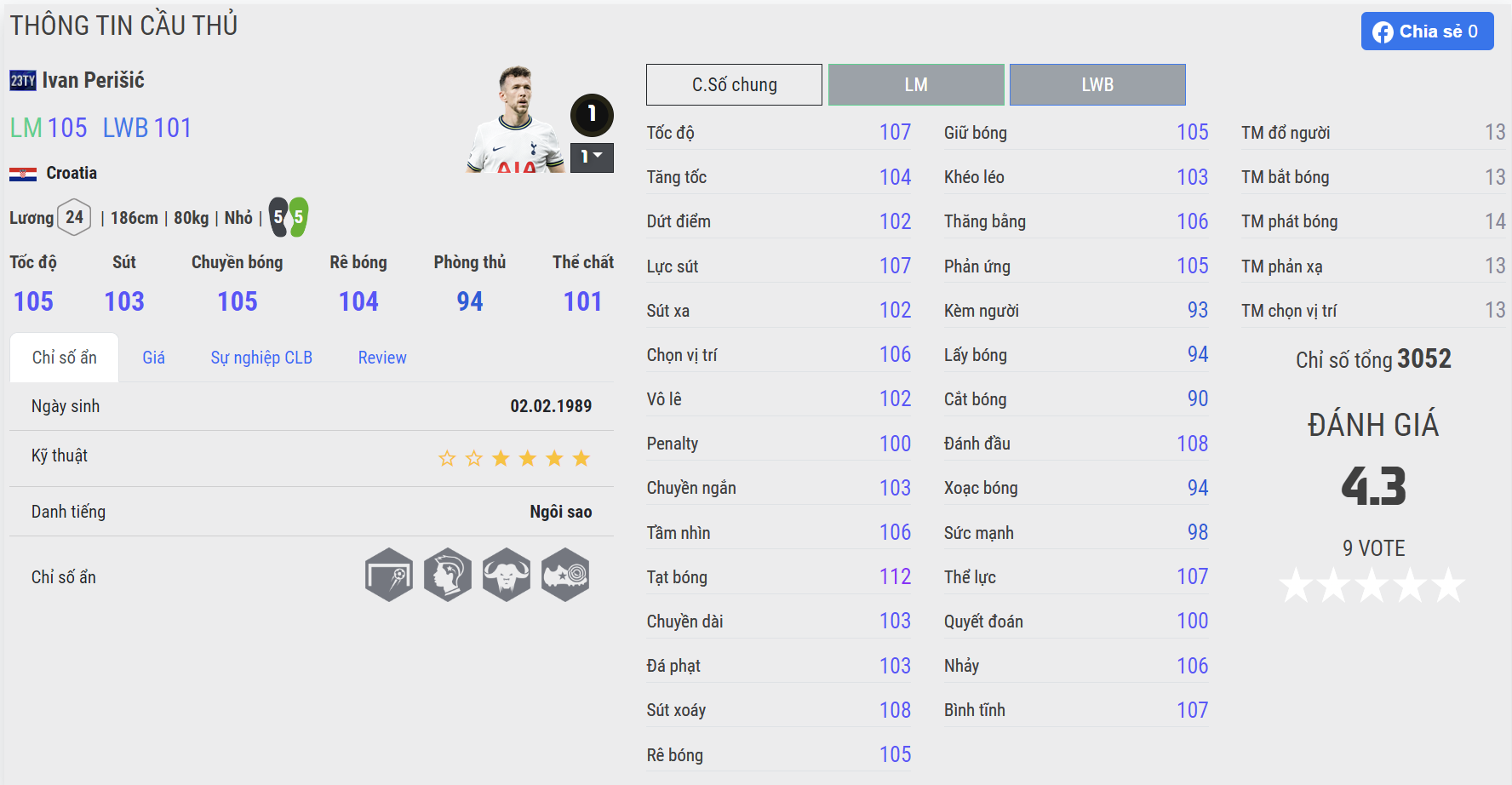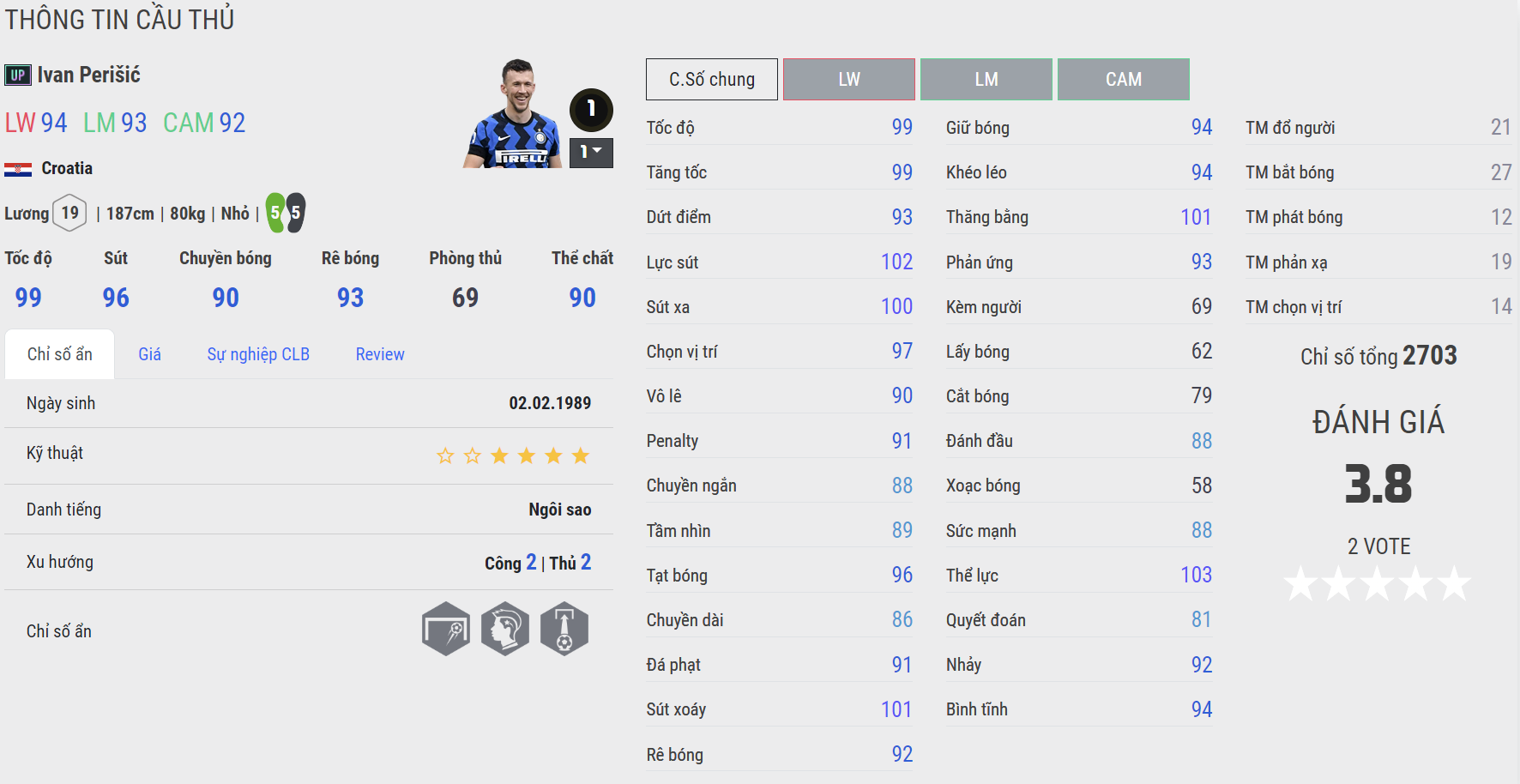 Nhược điểm : Không quá nổi bật về một khía cạnh cụ thể nào, giành cho những người chơi thích một cầu thủ bình bình