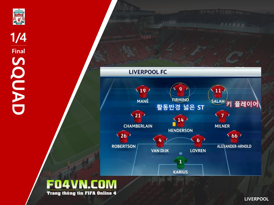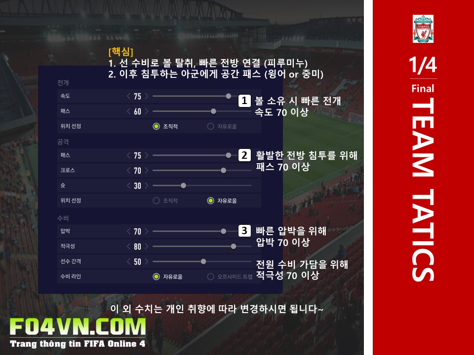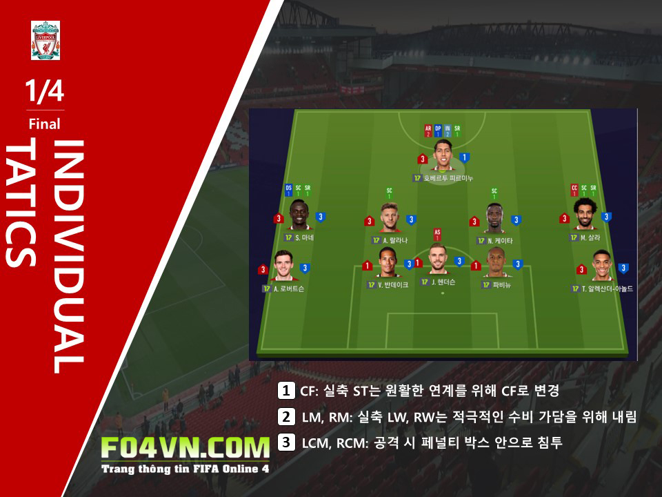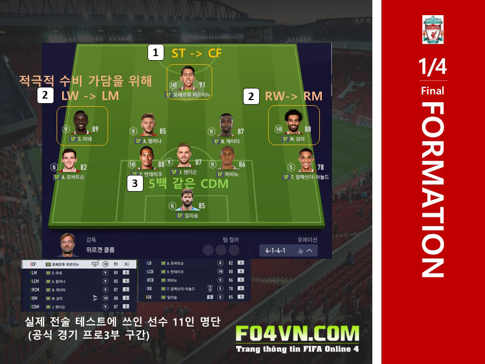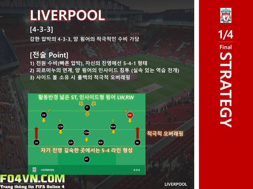 Để có thể vận hành sơ đồ chiến thuật của Liverpool trong game FIFA Online 4 được hiệu quả như ngoài đời, cần có một chút sự thay đổi vị trí trong đội hình.Cụ thể là 2 cánh RW,LW sẽ được kéo lui về thành RM,LM. Vị trí tiền đạo cắm thay vì ST sẽ để thành hộ công CF giúp hỗ trợ tấn công cho 2 vị trí cánh mỗi khi tham gia tấn công, cùng với đó là luôn sẵn sàng lùi thấp hỗ trợ phòng ngự. CM trung tâm kéo xuống thành CDM để có thiên hướng hỗ trợ phòng ngự tốt hơn.