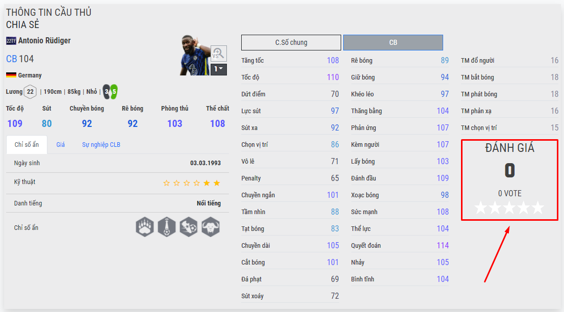 Khi bạn bấm vào giao diện chi tiết chỉ số của một cầu thủ, bạn sẽ nhìn thấy hàng ngôi sao màu trắng ( tức là bạn chưa từng vote cho cầu thủ đó ). Hãy bấm vào ngôi sao để chọn mức điểm mà bạn đánh giá từ 1-->5. Bạn hoàn toàn có thể lựa chọn mức 3,5 sao hay 4,5 sao nếu muốn.