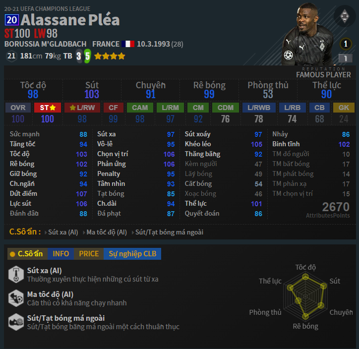 Tiền đạo người Pháp đang chơi cho CLB Borussia Mgladbach là một cái tên khá là lạ với cộng đồng FO4. Tuy nhiên chỉ với việc ra mắt mùa giải 20UCL, anh bổng nổi như cồn vì chỉ số lên tới 100, ngang hàng với Ronaldo và Messi. Vậy thực lực của Plea trong game ra sao, mời các bạn theo dõi