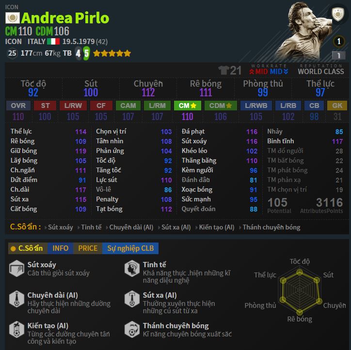 Thật ra chỉ số dứt điểm của thẻ ICON Pirlo khá thấp, cái này từ fo3 đã vậy rồi, nhưng vấn đề là Pirlo không vào vóng cấm để đóng hay DD. Mà bạn hãy ZD hoặc sút xa để cảm nhận sự khác biệt. Dù có neft theo meta thì Pirlo vẫn còn đó phẩm chất tuyệt vời này, nhất là anh là thẻ ICON ít bị can thiệp.