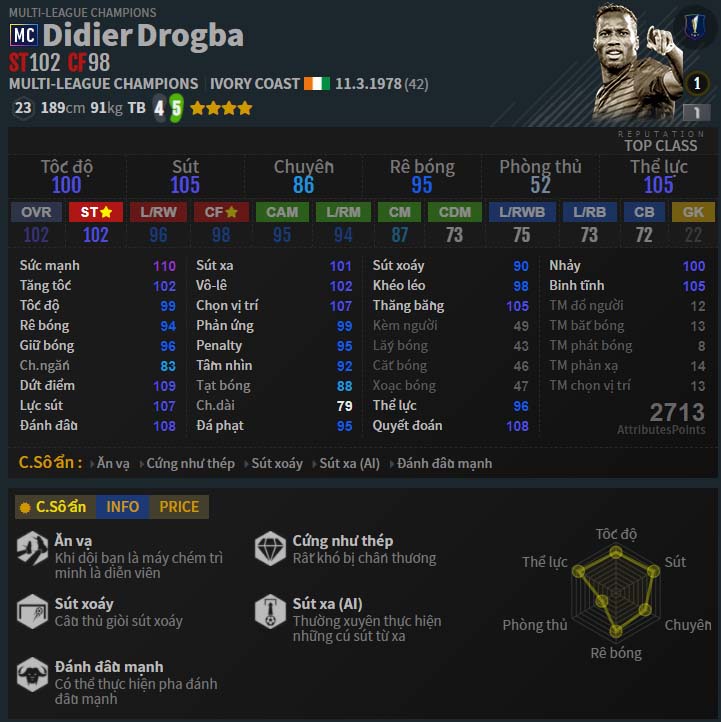 * Rê bóng : Mặc dù với 4 sao kỹ thuật, bạn có thể thực hiện nhiều skill. Nhưng chú ý một chút là Drogba hơi thô. Xoay sở có phần hơi cứng do thể hình quá to.