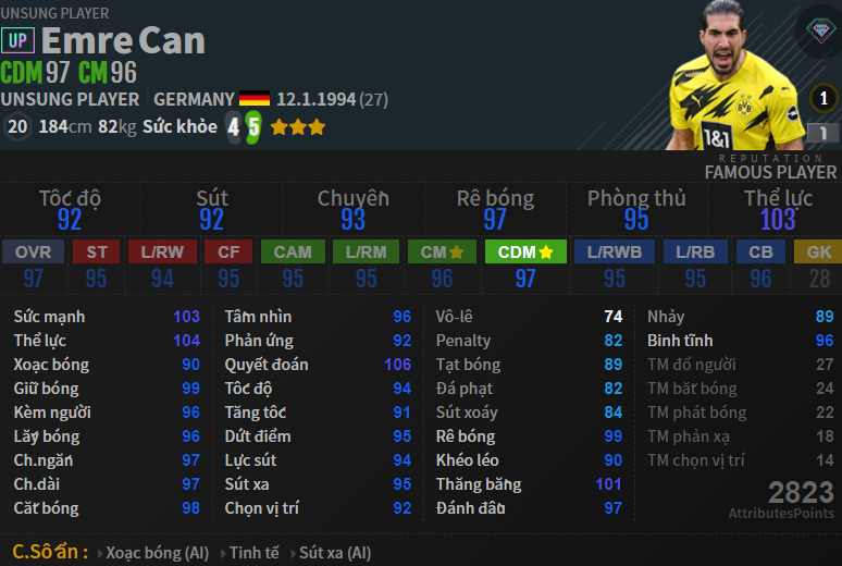 khả năng hỗ trợ tấn công của Can có thể nói là tệ. Chuyền thì vẫn tốt, không sắc, nhưng sút thì sẽ là thảm họa nếu bạn muốn dùng anh chàng này để ghi bàn. Bởi cả sút xa lẫn sút gần thì đều có tỷ lệ hỏng rất cao