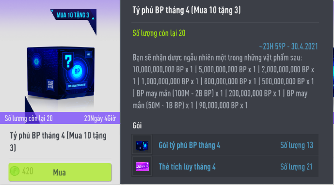 Với việc mua 10 gói bạn sẽ được tặng 3 gói, tổng cộng là 13 gói BP ngẫu nhiên + 21 thẻ tích lũy tháng 4