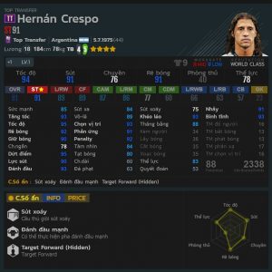 - Di chuyển : lùi tương đối sâu, đôi khi những tình huống dốc bóng xuống biên nhưng Crespo còn chưa lên đến vòng cấm đối phương, AI của cầu thủ này không thích hợp với bạn nào thích ST luôn mọc dễ bên trên
